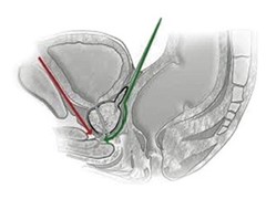Με πράσινο η νέα οπίσθια προσέγγιση με διατήρηση του χώρου του Retzius.Με το κόκκινο η συμβατική-πρόσθια προσέγγιση με τραυματισμό σημαντικών ανατομικών δομών.