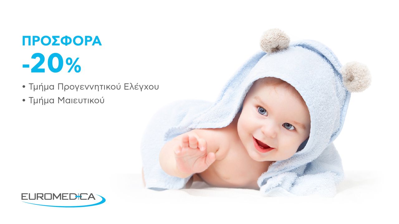 Επίσης, προσφέρεται 20% και στο Μαιευτικό Τμήμα στα πακέτα τοκετού. Για να εξασφαλιστεί η εν λόγω έκπτωση, απαιτείται πληρωμή προκαταβολής 10% του συνολικού πακέτου αποκλειστικά κατά το διάστημα 8/4 έως 21/4. Οι τρόποι πληρωμής είναι οι ακόλουθοι: μετρητοίς ή με τραπεζική κατάθεση (στη δεύτερη περίπτωση είναι υποχρεωτική η αποστολή του αποδεικτικού κατάθεσης στη Γραμματεία Μαιευτικού στο maternity.sec.gc@euromedica.gr), ενώ στην αιτιολογία πρέπει να αναγράφεται το πλήρες ονοματεπώνυμο της επιτόκου.