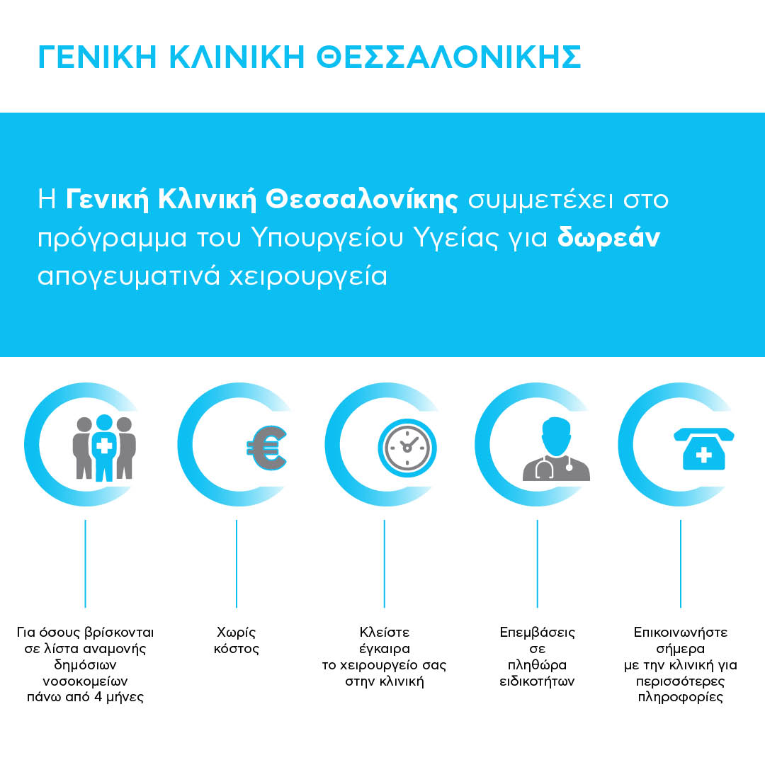 Η Γενική Κλινική Θεσσαλονίκης, συμμετέχει ενεργά στο πρόγραμμα του Υπουργείου Υγείας για δωρεάν χειρουργικές επεμβάσεις σε πολίτες που αναμένουν χειρουργείο σε δημόσια νοσοκομεία για πάνω από τέσσερις μήνες.